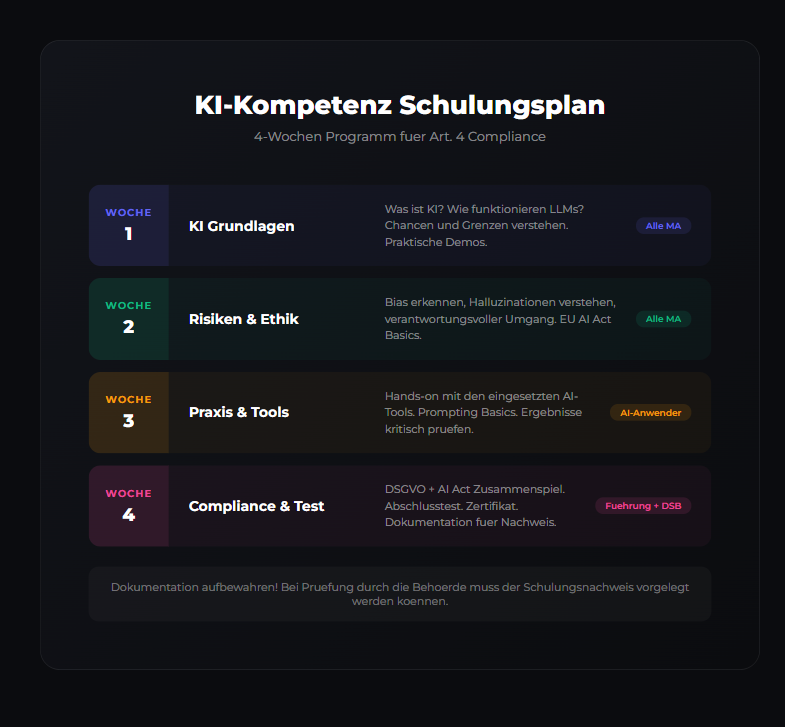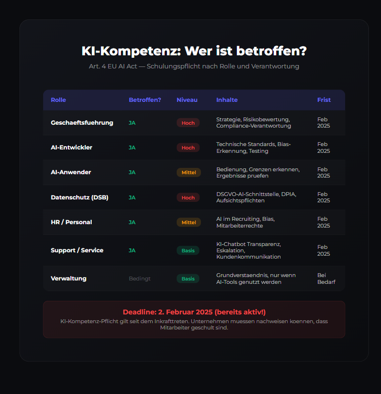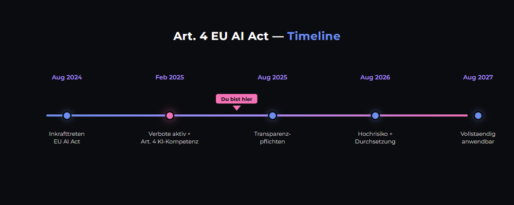 Artikel 4 des EU AI Act (Verordnung (EU) 2024/1689) verpflichtet alle Anbieter und Betreiber von KI-Systemen, sicherzustellen, dass ihr Personal über ein ausreichendes Mass an KI-Kompetenz verfügt. Das gilt unabhängig von der Risikoklasse des KI-Systems — also auch für Minimal-Risk-Anwendungen wie Chatbots oder Empfehlungssysteme.