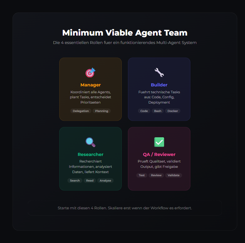Ein Multi-Agent System funktioniert nur mit klaren Rollen. Jeder Agent muss wissen, was seine Aufgabe ist, welche Boundaries er hat und an wen er bei Problemen eskaliert — wie in einem menschlichen Team.