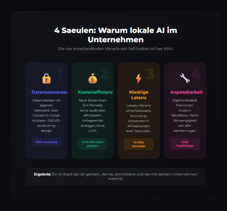 Cloud-AI ist schnell gestartet, aber nicht immer die beste Default-Option. Lokale AI gibt dir mehr Datensouveränität, planbare Kosten und Kontrolle über Betrieb und Zugriff.
