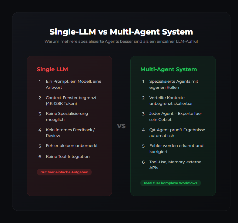 Ein einzelnes LLM ist wie ein Generalist — es kann viel, aber nichts wirklich perfekt. Multi-Agent Systeme nutzen das Prinzip der Arbeitsteilung: